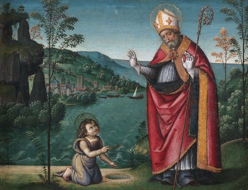 Secondo una leggenda medievale, Agostino stava riflettendo sulla Trinità quando notò un bambino impegnato in un’operazione curiosa: voleva travasare tutto il mare nella buca che aveva scavato. Alla sua paziente obiezione, il bambino replicò serio: “Anche a te è impossibile scandagliare con la piccolezza della tua mente l’immensità del mistero trinitario”.